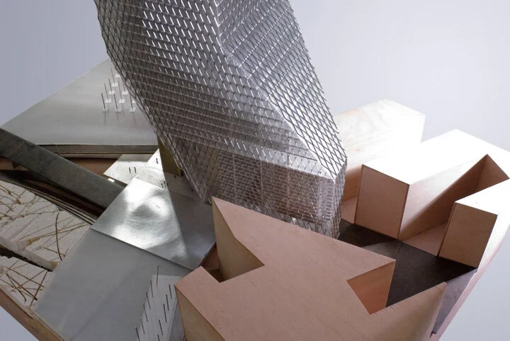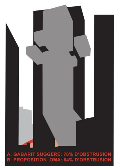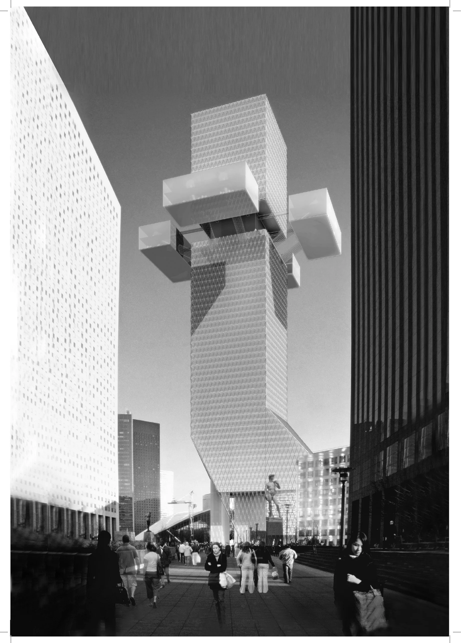 “We inserted the building in a complicated infrastructural situation, then reinstall a rational square plan and finally oriented the tower, with projecting satellites to the metropolis. The lighthouse tower is a synthesis of La Defense towers generations, interacting with infrastructure, offering back a rational plan, providing a new symbole.”