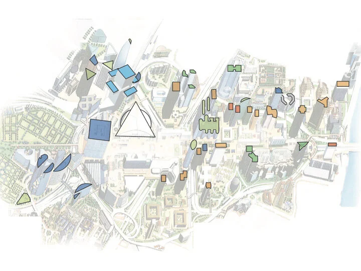 Each of these conditions influenced our design, and results in three different operations: creation of a base, reinstallation of rationality, projecting light outwards towards the city.