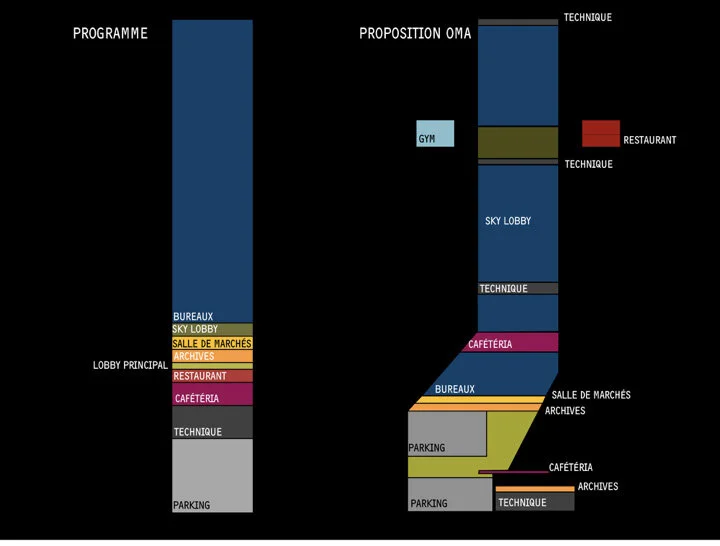 One of the weaknesses of the skyscraper is the fact that it hides its most precious organs. At the level of the sky-lobby, we propose to radicalize the status of the skyscraper into a body with organs: four satellites hover around the main volume containing the most public functions of the building making them autonomous. In the heart of the tower this gesture liberates space for a forum with surprising views over Paris. Seen from the French Capital, the profile of the tower will never be seen as just another rational and sober tower.